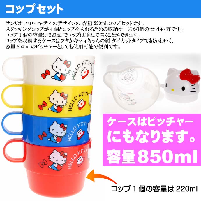 ハローキティ コップ4個 ケース兼ピッチャー付 SKATER(スケーター)キャラクターグッズ 入園 入学 グッズ 用品 4973307365188 KS32SD サンリオ ハローキティ のデザインの 容量220ml コップセットです。