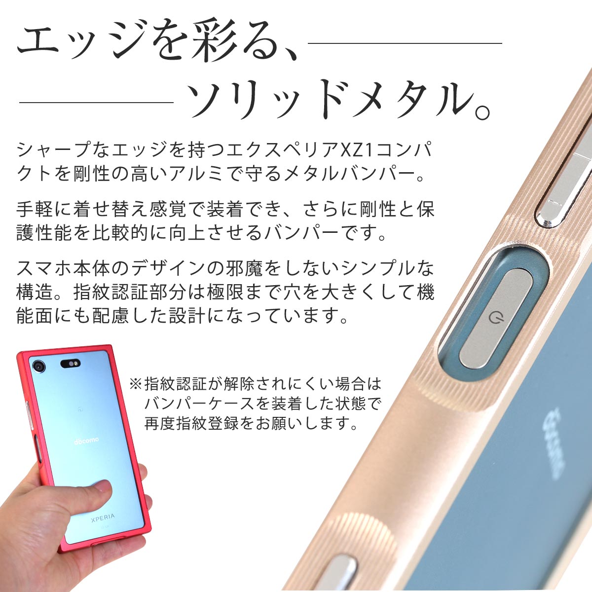 商品名称 Xperia XZ1 Compact SO-02K アルミメタルバンパー 適応機種SONY エクスペリアXZ1コンパクト ドコモ:SO-02K カラー ゴールドグレーレッドシルバーブラックピンク 商品説明 指紋認証もバッチリ。