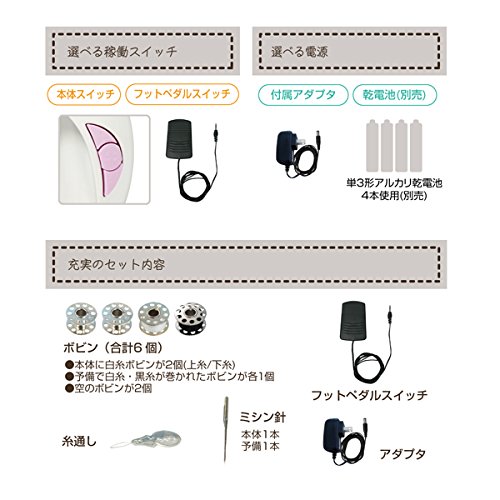 すぐに使えるスターターセット(ボビン、ミシン針、糸通しなど) 商 品 仕 様 サイズ W19.5×D12.5×H20.5cm 重量 約1.1kg(パッケージ含む) 材質 ABS、スチール 電源 交流式/乾電池式 両用 消費電力 5W 速度調整 速度切替2段階調節 コード長 180cm 保 証 に つ い て この商品には、メーカー保証がございません。